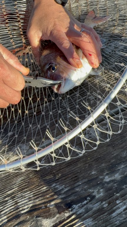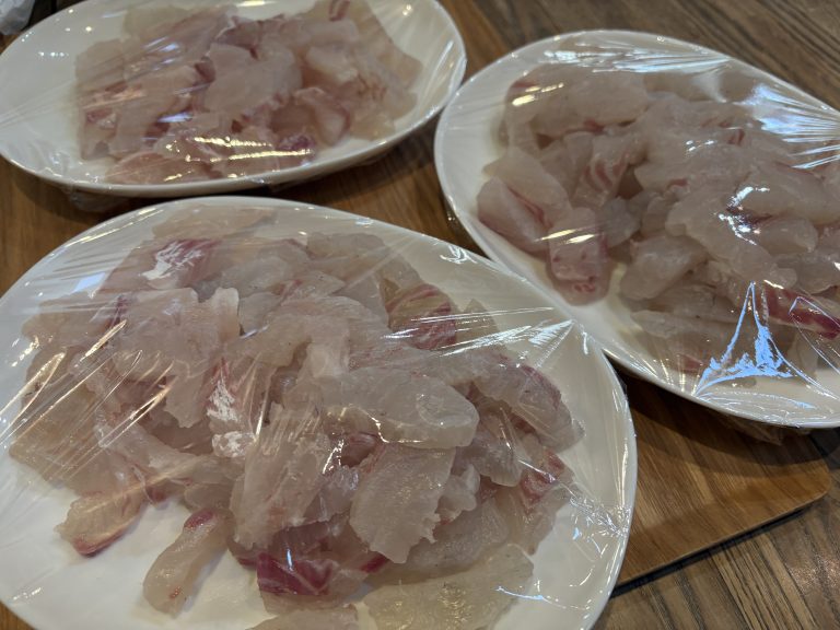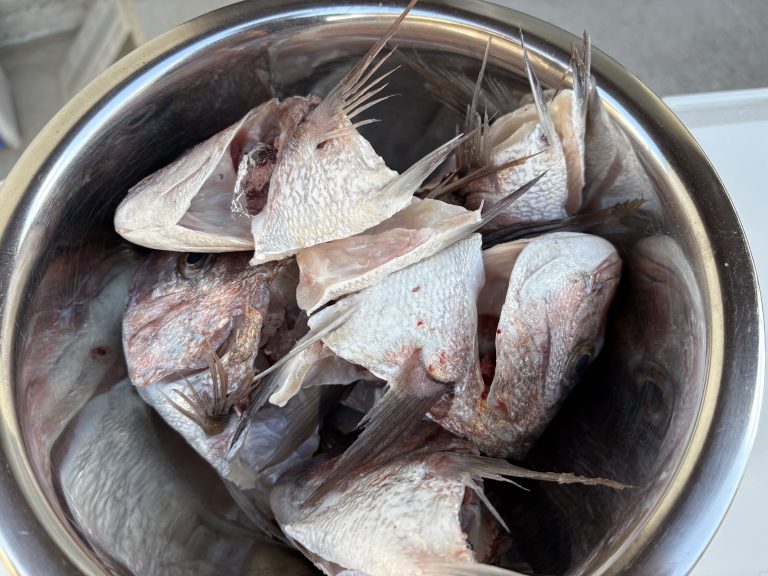 今回は、釣った鯛を釣堀りで3枚におろしてもらいました。料金かかるけど、帰ってからの労力を考えたらアリです。